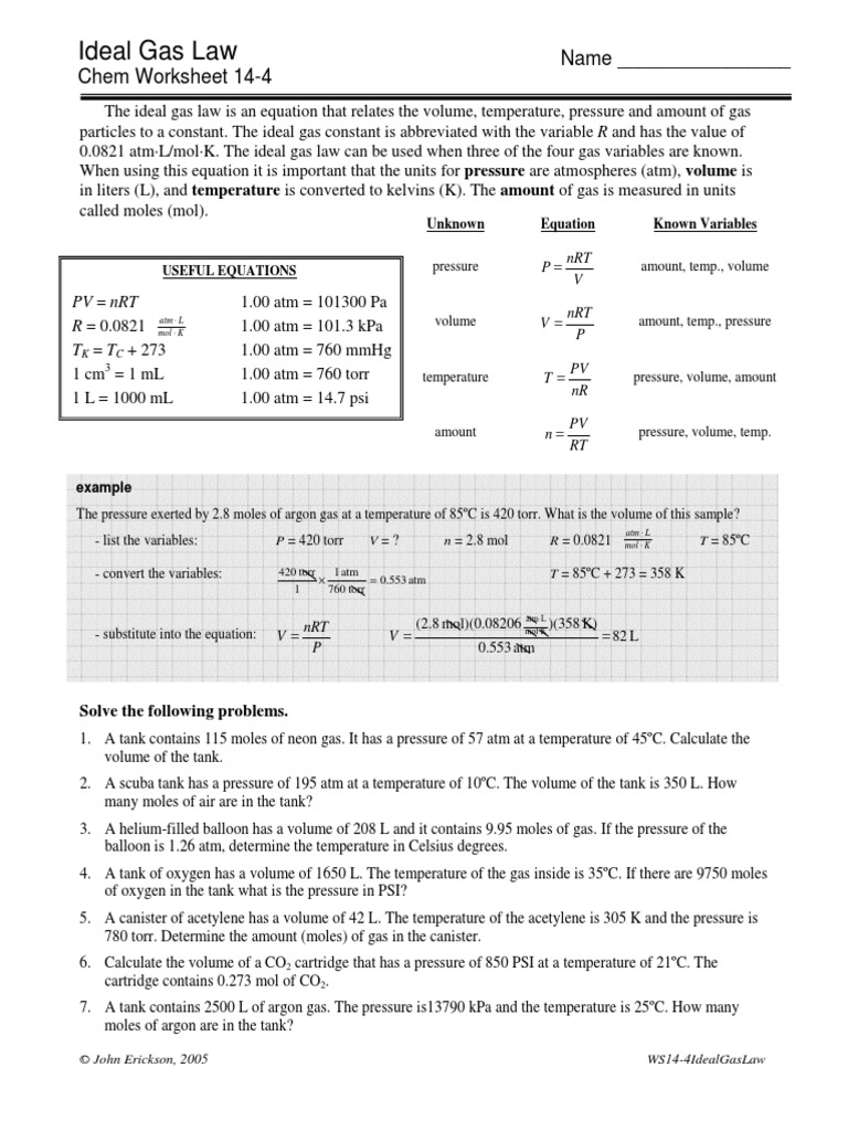 Worksheet On Ideal Gas Equation - Combined Gas Law Complete The Chart Balop : This worksheet contains an explanation of the relationship between the volume of a gas, pressure of a gas, number of moles of the gas and the temperature of the gas.. A sample of gas has a volume of 215 cm3 at 23.5 °c and 84.6 kpa. Calculate the temperature of a gas if 0.5 moles occupy 1.2 dm3 at a pressure of 200 kpa. Jetzt mit verivox über 8.000 gastarife vergleichen und wechseln. There are a total of 8 problems.answer key is included.the download includes a handout master (.pdf) that includes one worksheet, and answer key.this produc. It reminds the students of several relationships among moles, molar mass, number of molecules, etc.